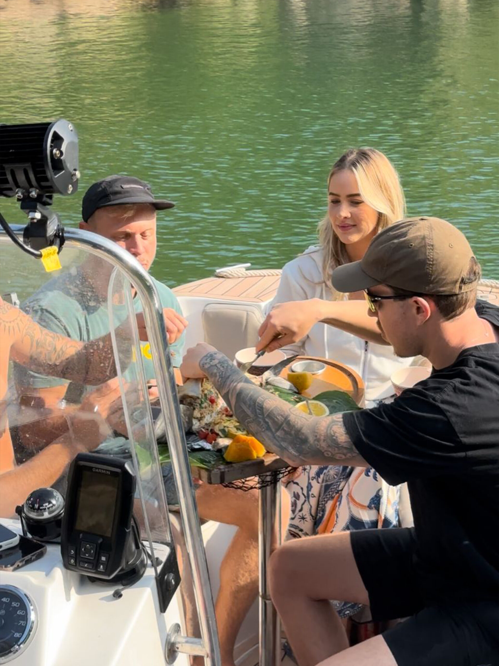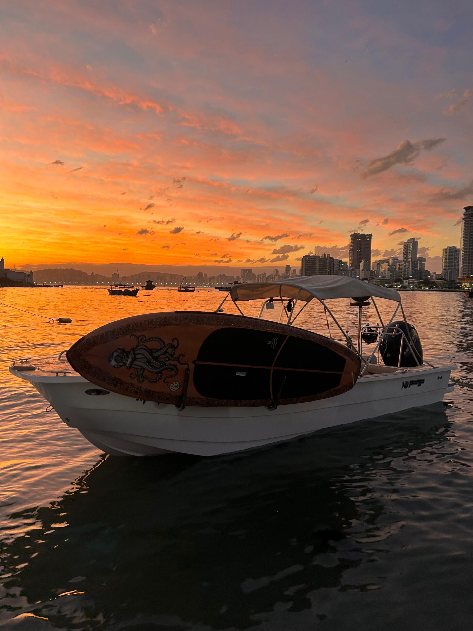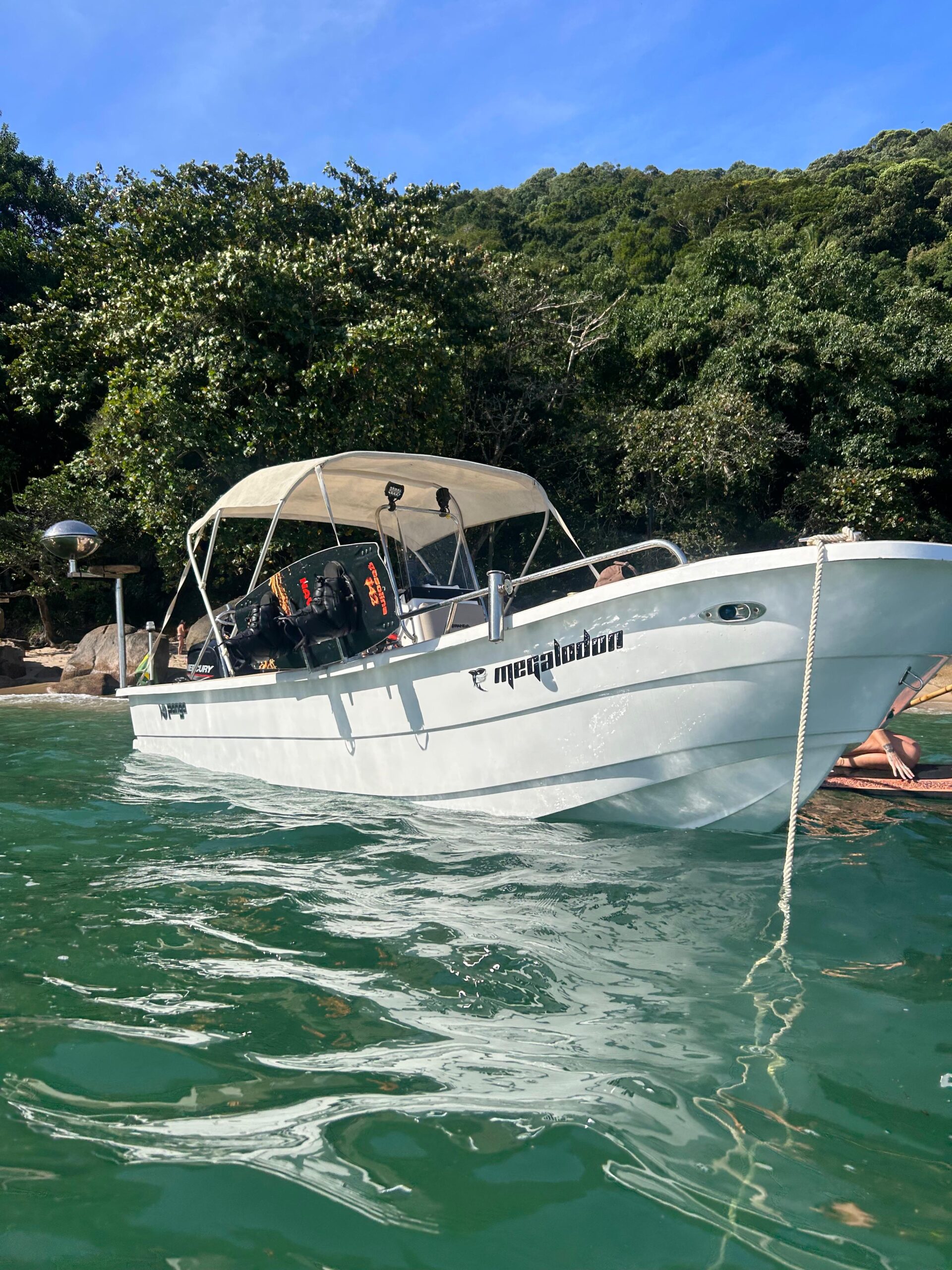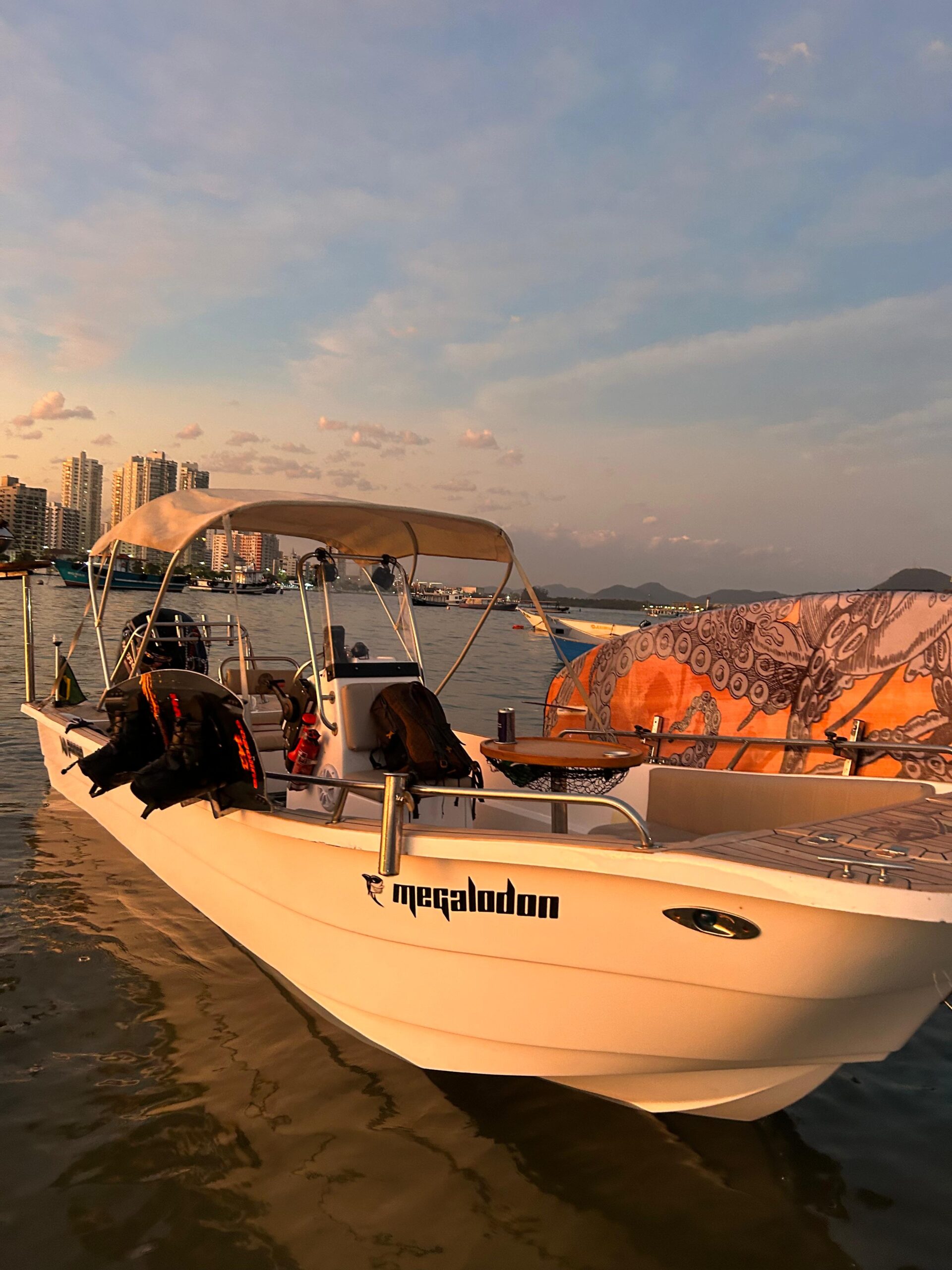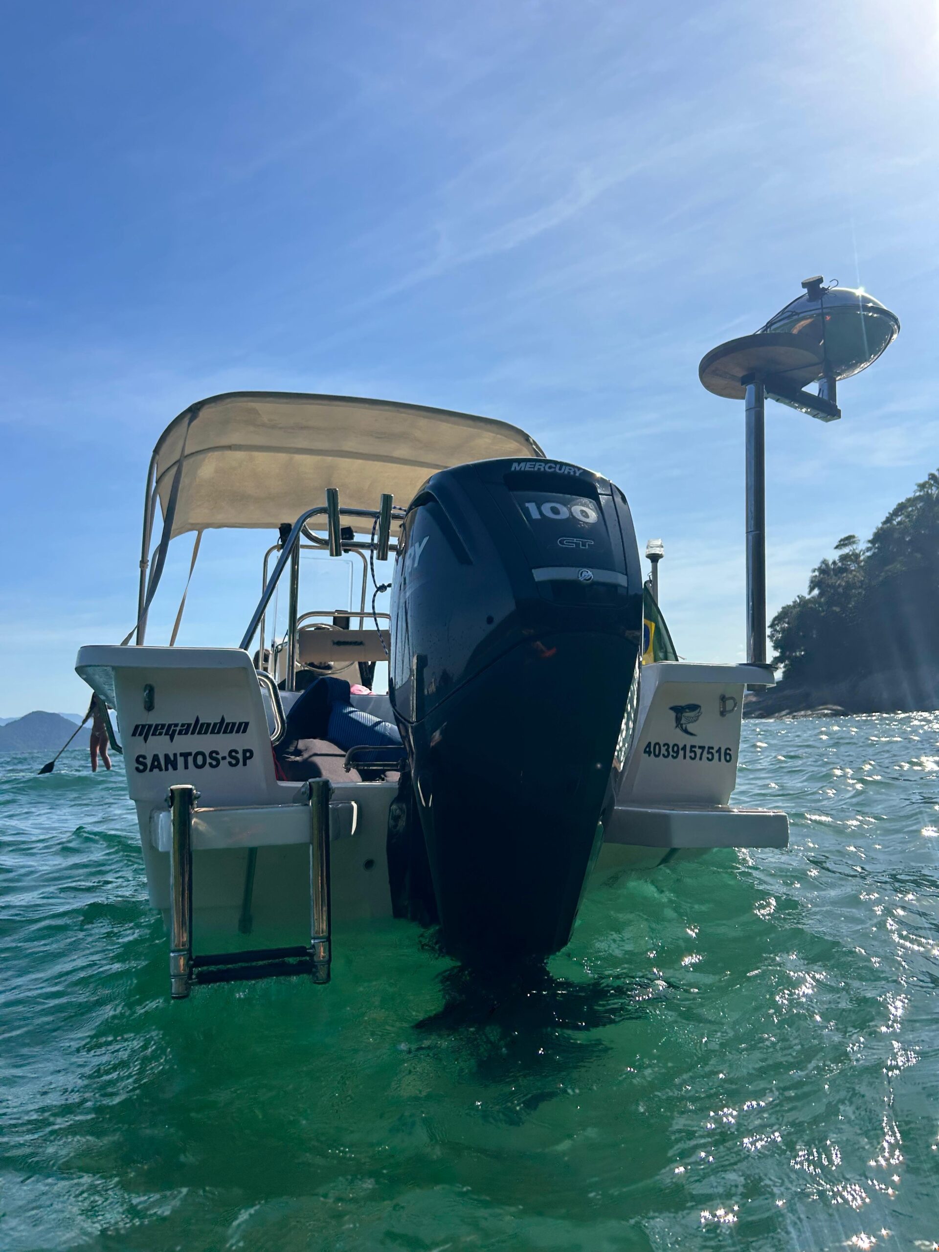 Estrutura: assentos acolchoados, suporte para pesca, escada e cobertura parcial (toldo).